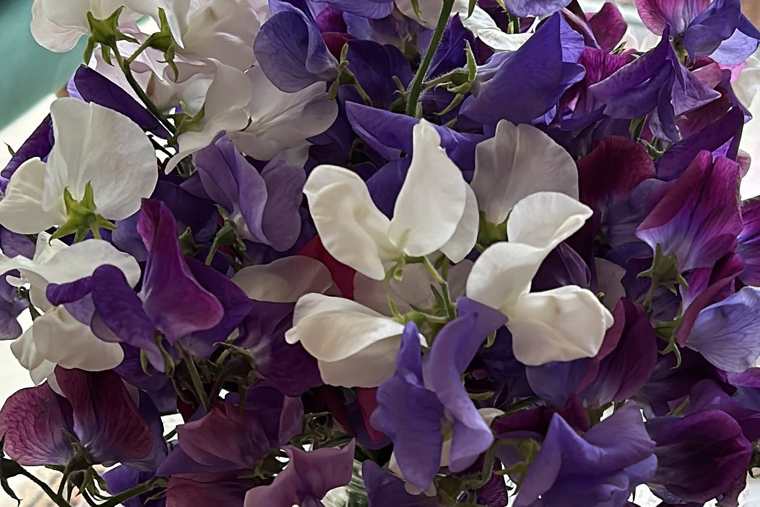 To keep sweet peas flowering, you need to keep deadheading. Sometimes this means going out twice a day to remove the spent blooms. But they will keep repaying you, with more beauty and fragrance.